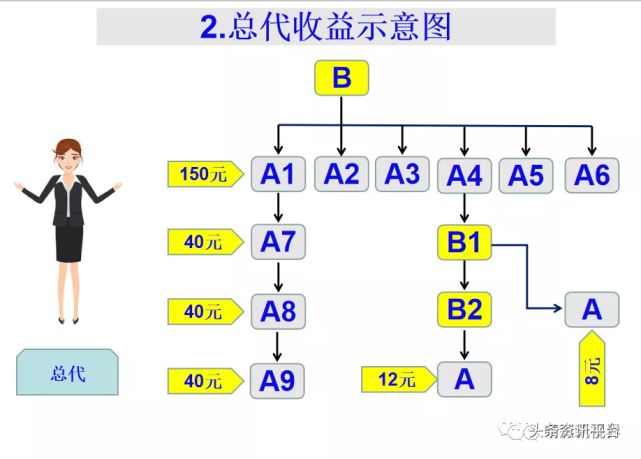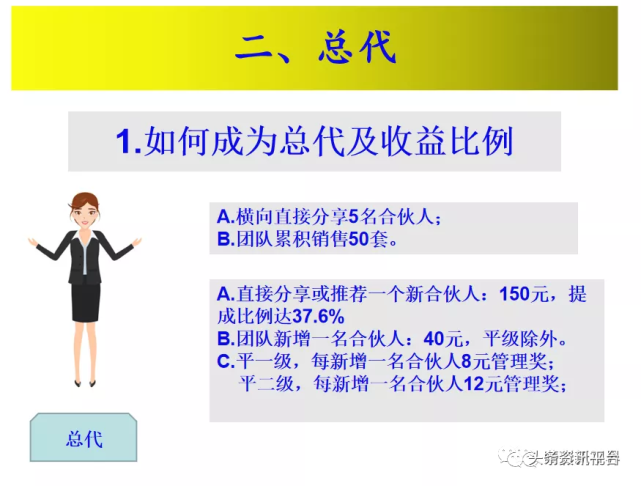 (2)总代:①直接分享5名合伙人或者团队累积销售50套产品即可升级成总代。②总代直推一个合伙人,奖励150元(秒到),提成比例达37.6%。③总代间推一个合伙人,奖励40元(秒到),平级除外。④平级奖,平一级8元,平二级12元。