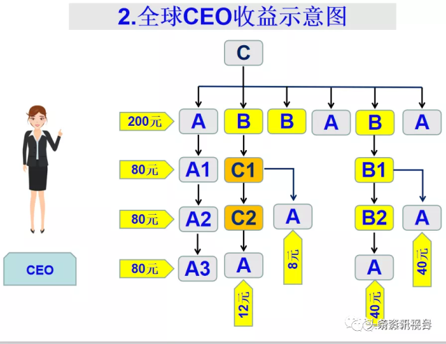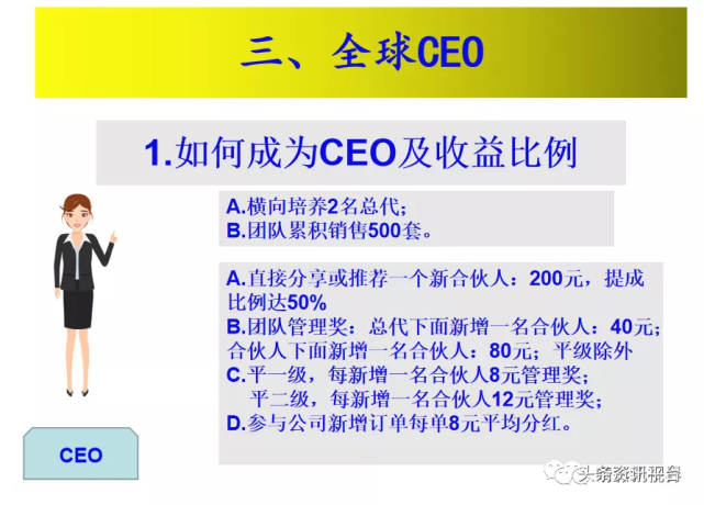 3)全球CEO:①培养两个总代及以上或者团队累积销售500套。②CEO直推一个合伙人奖励200元,提成比例达50%。③团队管理奖:总代下面招一个合伙人奖励40元,合伙人招一个合伙人奖励80元。④平级奖:平一级奖励8元,平二级奖励12元。⑤公司新增订单每单8元,平均分给达成CEO级别的领导人。例如,本月公司完成2万单,公司拿出16万奖金,假如CEO有50人,则每位CEO领导人可以分红160000÷50=3200元。每月5日之前准时分红。没有任何业绩考核,只要达成就能参与,以上奖励均秒到。
