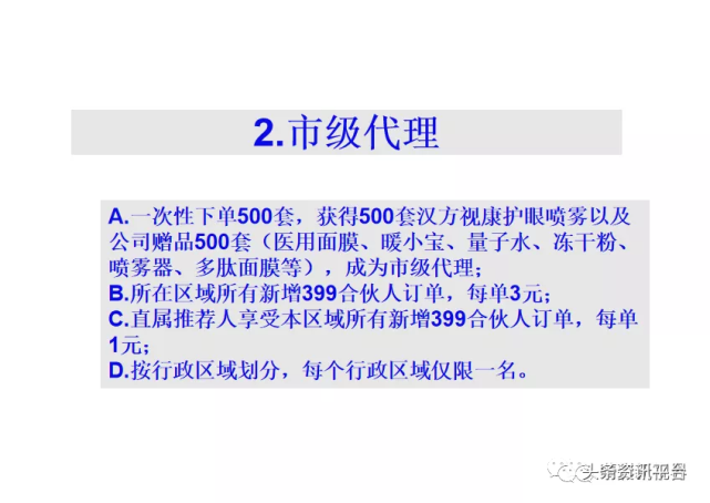 (2)市级代理:①一次性下单500套, 获得500套产品和500套赠品,并成为市代。②所有本地区(以快递落地地址为准)每一个399订单,奖励代理3元。③直属推荐人享受每单1元。例如,贵阳市南明区,本月有5000单寄到南明区,那么南明区市代可以得到1.5万元收入。上级推荐人得到每单1元,也就是5000元。④每个行政区域仅限一名。