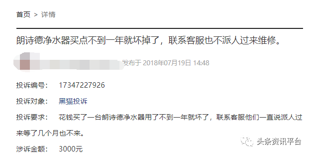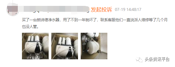 在黑猫投诉网站上,网友王先生投诉称:“朗诗德净水器用了不到一年就坏了,联系客服他们一直说派人维修等了几个月也没人管”。
