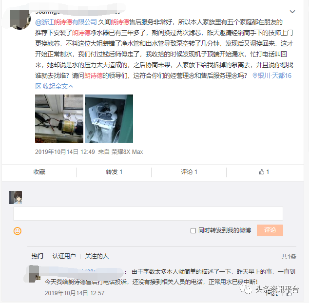 在微博上,也有用户反映:“久闻朗诗德售后服务非常好,所以本人家族里有五个家庭都在朋友的推荐下安装了朗诗德净水器已有三年多了,期间换过两次滤芯,昨天邀请经销商手下的技师上门更换滤芯,不料这位大姐装错了净水管和出水管导致泵空转了几分钟,发现后又调换回来,这才开始正常制水,我们付过钱后师傅走了,我收拾的时候发现机子顶端开始漏水,忙打电话叫回来,她却说是水的压力太大造成的,之后协商未果,人家放下给我拆掉的泵离去,并且说你想找谁就去找谁。请问朗诗德的领导们,这符合你们的经营理念和售后服务理念吗?”