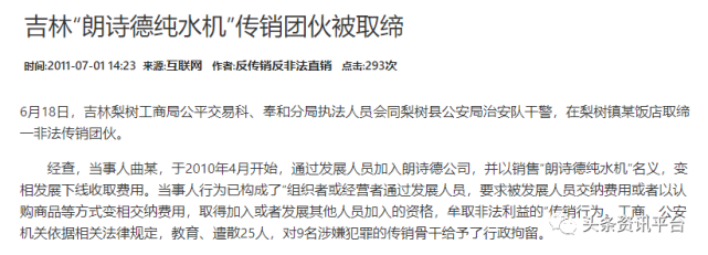 也在是十年前左右,据反传销反非法直销网报道称,吉林梨树工商局公平交易科、奉和分局执法人员会同梨树县公安局治安队干警在梨树镇某饭店取缔一非法传销团伙。经查,当事人曲某,于2010年4月开始,通过发展人员加入朗诗德公司,并以销售“朗诗德纯水机”名义,变相发展下线收取费用。当事人行为已构成了“组织者或经营者通过发展人员,要求被发展人员交纳费用或者以认购商品等方式变相交纳费用,取得加入或者发展其他人员加入的资格,牟取非法利益的”传销行为。工商、公安机关依据相关法律规定,教育、遣散25人,对9名涉嫌犯罪的传销骨干给予了行政拘留。(由于此两条信息年代久远,且来源皆为网络,其真实性尚有待考证)