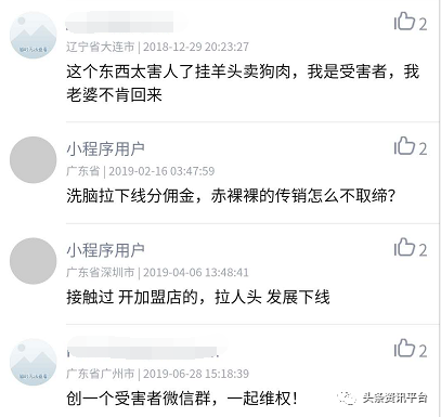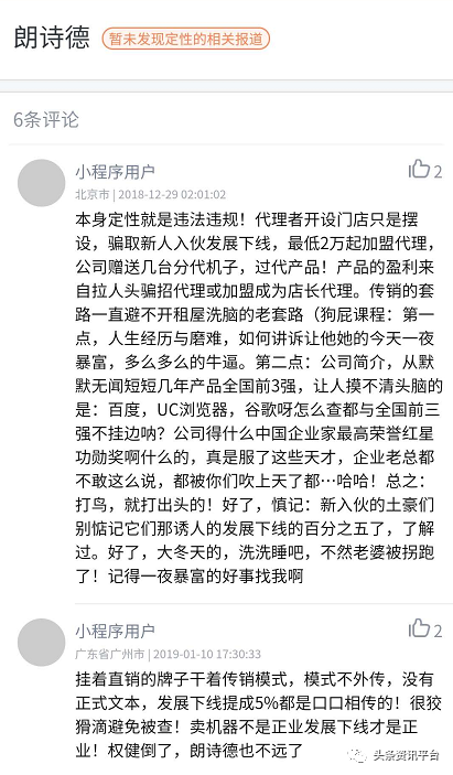 值得关注的是,在评论页面中,还有多位小程序用户声称该项目就是“拉人头发展下线”、是“赤裸裸的传销”等,还有用户希望能成立一个朗诗德的受害者维权群,以便共同维权。