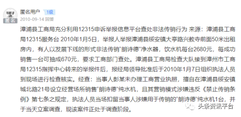 当时,在天涯社区等网站上,就有许多咨询朗诗德产品的提问,在众多回答当中,有这样一条信息颇为引人注意,有人回复称:2010年1月5日,举报人举报漳浦县绥安镇大亭路兴教寺前面50米出租房内,有人以发展下线的形式非法传销“朗诗德”净水器,饮水机每台2680元,每成功销售一台可抽成670元,要求工商部门查处。漳浦县工商局检查大队接到漳州市工商局12315指挥中心转来的举报件后,报经局领导批准后于2010年1月7日组织执法人员到现场进行检查核实。经查,当事人彭某未办理工商营业执照,擅自在漳浦县绥安镇城北路21号设立经营场所销售“朗诗德”纯水机,且其营销模式涉嫌违反《禁止传销条例》第七条之规定,执法人员当场扣留当事人涉嫌用于传销的“朗诗德”纯水机1台,并于当天立案调查。