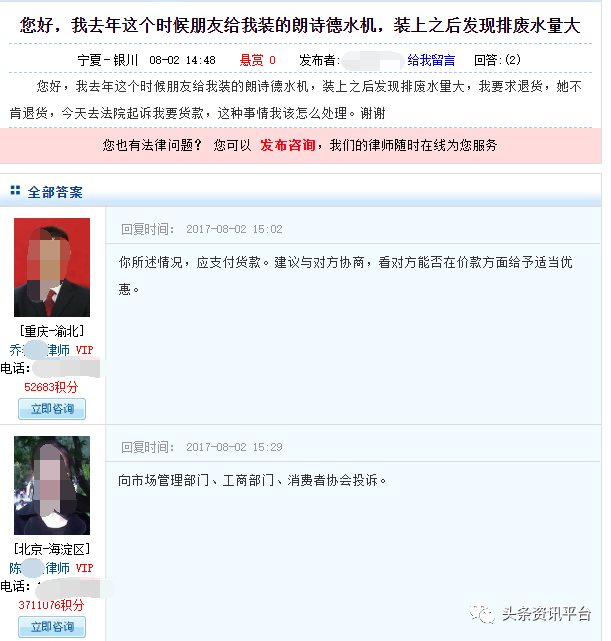 在投诉通网站上,杨先生也对“朗诗德净水机售后服务漫天要价”的问题进行过质疑。