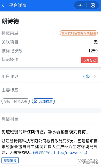 在腾讯灵鲲金融风险监管平台上,“朗诗德”这个关键词也已被标记了1259次。虽然标记类型是“暂未发现定性的相关报道”,不过其主要标签有“发展下线拉人头”的字样。