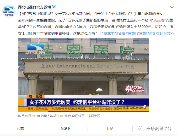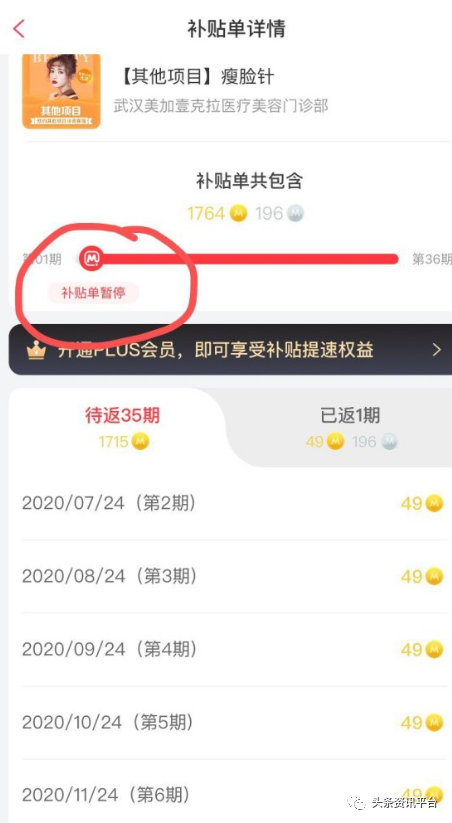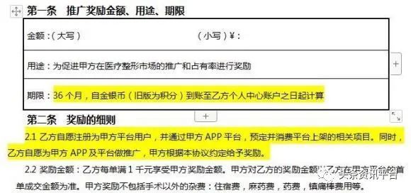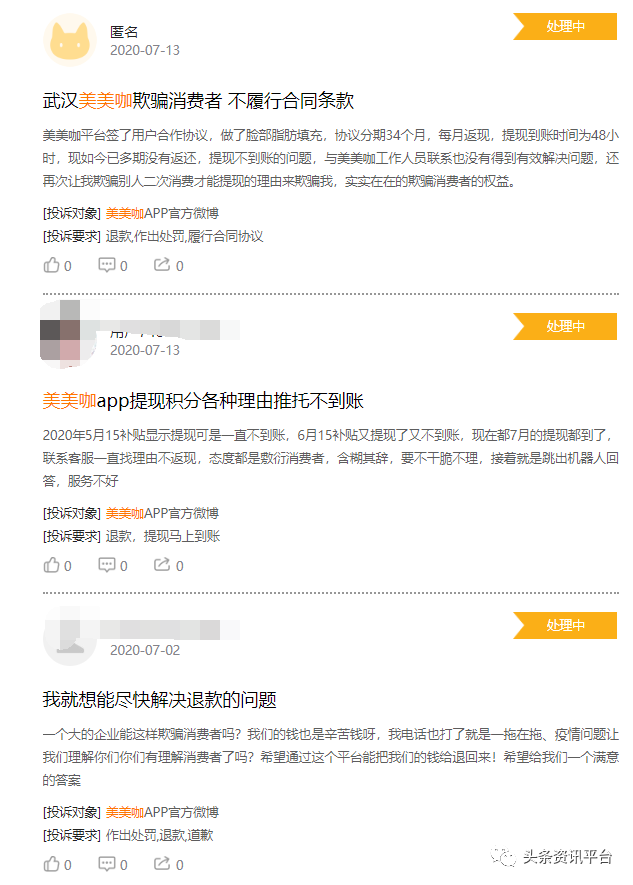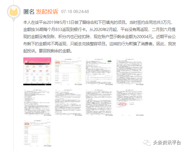 另外一位匿名网友则投诉称:“本人于2019年5月13日在该平台上做了眼综合和下巴填充的项目,总共3万元,根据合同,返还金额按36期计算,每个月有833元返现到银行卡上。但从2020年2月起,平台没有再返现,2月到6月提现的金额也没有到账,积分也已经扣除,现在账户显示剩余金额为20004元。近期平台公布剩下的金额将不再返现,只能去兑换整容项目。这样的行为欺骗了消费者。因此,我发起投诉,要回我剩余的金额。”
