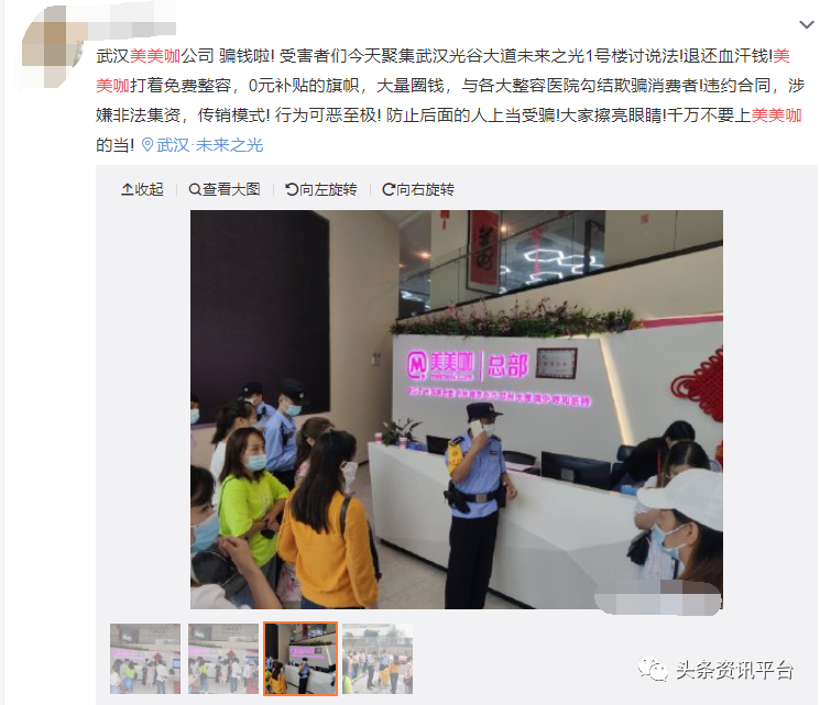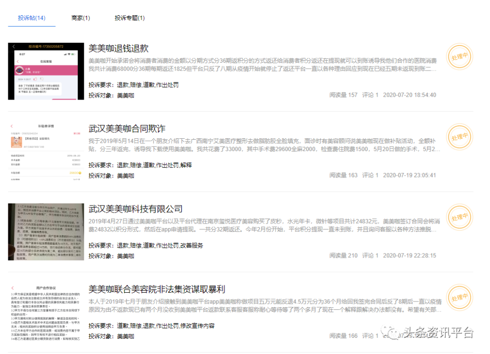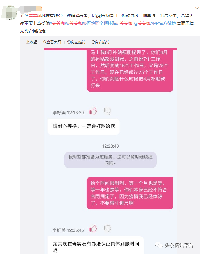 “美美咖不按合同返还佣金,还我血汗钱”、“武汉美美咖拒不履行合同”、“武汉美美咖合同欺诈”、“美美咖公司以疫情为理由不正常履行合同约定返款”等投诉信息随之成为了维权热词,多家医美行业乃至其他行业的媒体纷纷指出,美美咖目前已因未能按时兑现对消费者的承诺,陷入整形补贴兑付危机。
