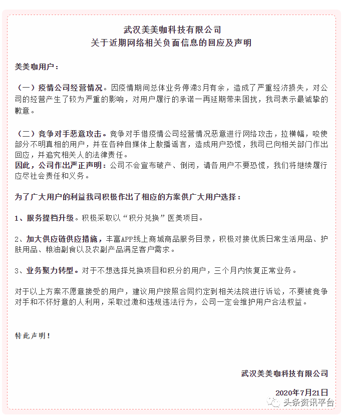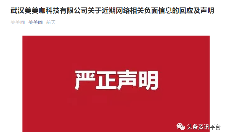 7月21日,美美咖方面发布《武汉美美咖科技有限公司关于近期网络相关负面信息的回应及声明》,《声明》指出:近日,竞争对手借疫情公司经营情况恶意进行网络攻击,拉横幅,唆使部分不明真相的用户,并在各种自媒体上散播谣言,造成用户恐慌。在此,我司严肃声明,消息纯属谣言,广大用户切勿信谣传谣,避免引起恐慌。