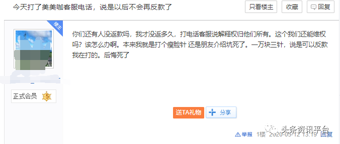 还有匿名网友投诉称:“美美咖打着虚假宣传广告,说补贴70%分36期返给客户,之前没说要做什么推广和买会员,现在要想拿到这个补贴就要做推广跟买会员,不然就拿不到补贴了,这个我觉得属于强制性消费,做双眼皮之前又没说要做什么推广和买会员,找客服也是和机器在聊天,提现说是24小时到账或者15天,我等了半个月也没到,现在管家跟我说要做推广跟买会员才拿得到补贴,我都做了双眼皮现在给我整这出,这就属于强制性消费了。”