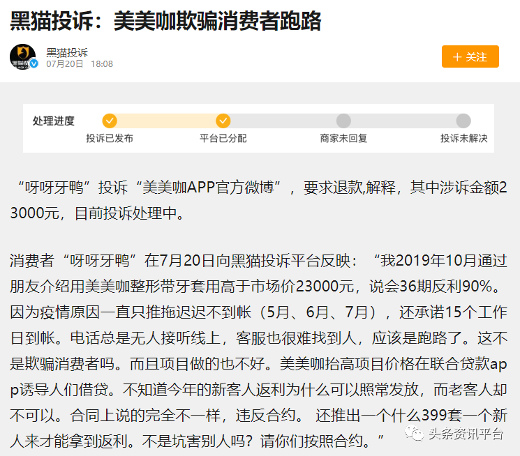 限于篇幅,本文只在其中摘取三条投诉信息作为典型与代表。网友“呀呀牙鸭”投诉称:“我于2019年10月通过朋友介绍使用美美咖整形牙套,消费额是高于市场价的23000元,说会36期返利90%。因为疫情原因,公司方面一直推拖,补贴款项迟迟不到帐(5月、6月、7月)。电话总是无人接听,线上客服也很难找到人,应该是跑路了。这不是欺骗消费者吗?而且项目做得也不好。美美咖抬高项目价格,又联合贷款app诱导人们借贷。不知道今年的新客人返利为什么可以照常发放,而老客人却不可以。和合同上说的完全不一样。最近,还推出一个什么399套一个新人来才能拿到返利。这不是坑害别人吗?请你们按照合约办事。”(内容有删改)