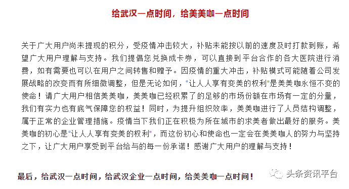 美美咖官方在6月6日表示:“关于广大用户尚未提现的积分,受疫情冲击较大,补贴未能按以前的速度及时打款到账,希望广大用户理解与支持。我们提倡您兑换成卡券,可以直接到平台合作的各大医院进行消费,如有需要也可以在用户之间转售和赠予。因疫情的重大冲击,补贴模式可能随着公司发展战略的改变而有所细微调整。”