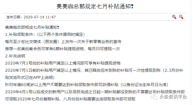 与此同时,《美美咖总部规定七月补贴通知》得以在网上发布,具体的补贴领取条件和补充说明如下: