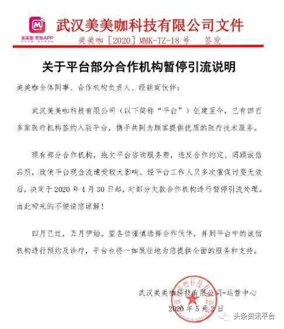 换言之,与常见的医美分期即美容贷关系紧密的美美咖不因此受到波及的可能性可谓是微乎其微。于是乎,在接下来的这段时间里,因补贴不按时发放,用户们针对美美咖的投诉与维权事件此起彼伏地出现,并在网上开始进一步地发酵。时间来到2020年5月,在相关投诉信息正令人目不暇接的时候,美美咖《关于平台部分合作机构暂停引流说明》的发布更是一石激起千层浪。