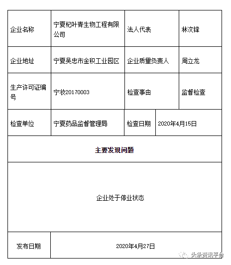 2020年4月27日,宁夏回族自治区药品监督管理局网站发布《关于公开化妆品生产企业监督检查信息的通报(化004期)》,通报了宁夏杞叶青生物工程有限公司等5家化妆品生产企业的监督检查情况。该公司被宁夏药品监督管理局检查出“企业处于停业状态”的问题。