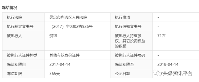 至于贺钧本人所持有的股权,也曾被吴忠市利通区人民法院冻结过一年的时间。