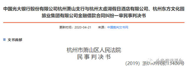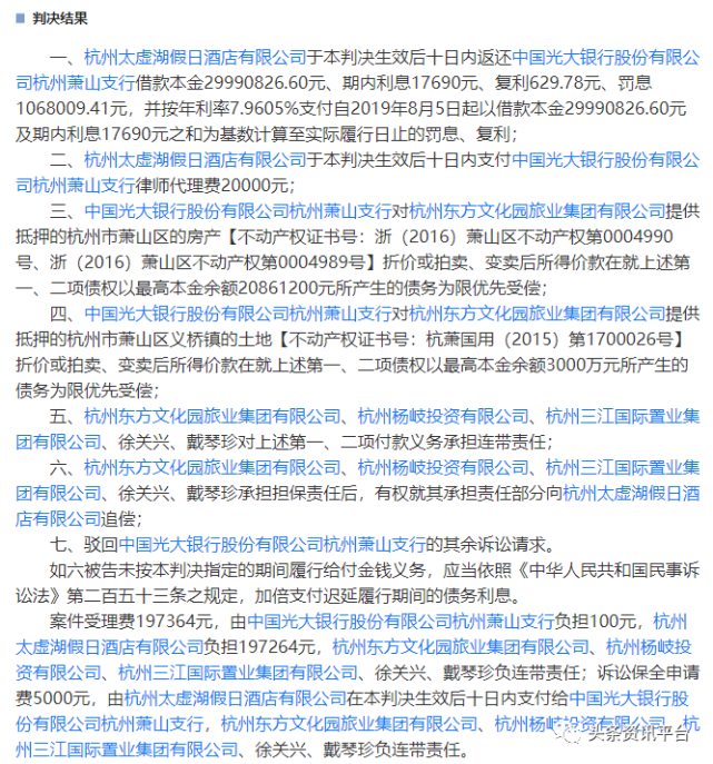 除了在民间借贷纠纷案件中进行无效的辩解外,在与银行发生金融借款合同纠纷时,徐关兴也不忘进行上诉。据《中国光大银行股份有限公司杭州萧山支行与杭州太虚湖假日酒店有限公司、杭州东方文化园旅业集团有限公司金融借款合同纠纷一审民事判决书》显示,杭州市萧山区人民法院最终判决如下: