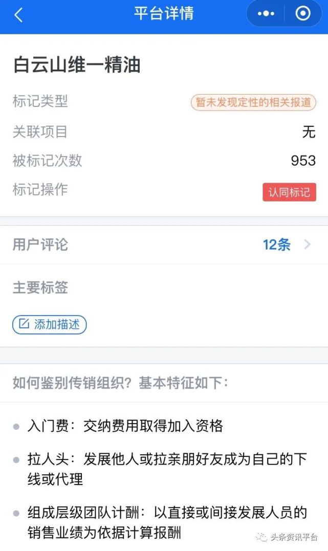 目前,在腾讯灵鲲金融安全平台上已经显示白云山维一精油被标记了953次,虽然暂未发现定性的相关报道,但在评论区可以明显看到,大众对它还是质疑颇多。