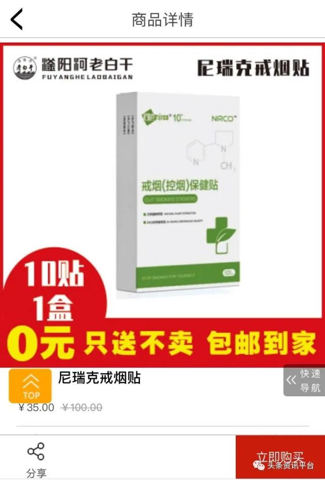 同样地,在滏阳河老白干商城的日用百货分类区,我们看到了一款叫做尼瑞克戒烟贴的产品,而这款产品,外界同样议论纷纷。