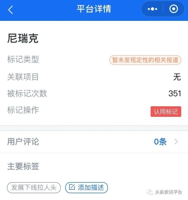 截至目前,在腾讯灵鲲金融风险查询举报中心平台上尼瑞克显示已被标记了351次,而主要标签为发展下线拉人头。