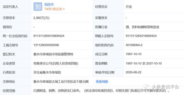 据了解,公司全名叫做衡水滏阳河酿酒有限公司,于1997年10月10日成立,注册资本2360万元,实缴360万元,法定代表人刘连河,董事长多银海。公司对外还投资了两家公司,分别是衡水滏阳河酒类贸易有限公司和衡水滏阳河酒业销售有限公司。