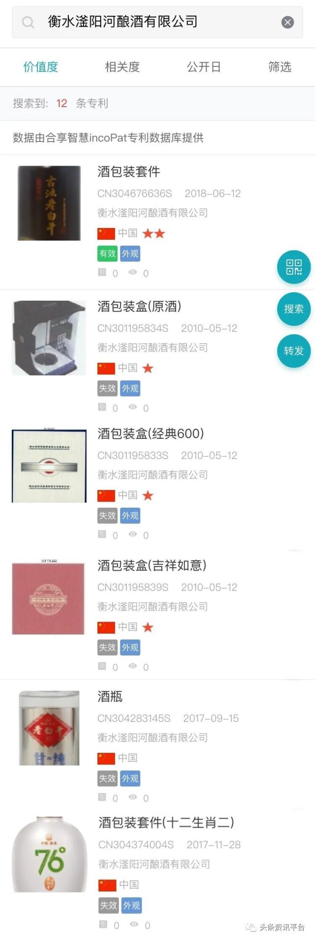 另外,衡水滏阳河酿酒有限公司目前拥有的十二项外观专利中,只有一款古法老白干的酒包装套件有效,其余的均因为未缴年费导致专利权终止。