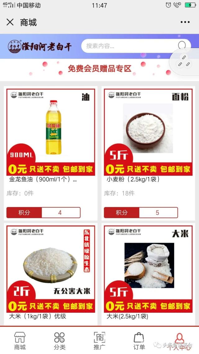 在前文开头我们提到滏阳河老白干推出了免费送大米的活动,活动的具体流程就是首先自己免费注册成为公司的免费会员,将生成的商城邀请码发送给其他人,只要有5个人注册成为免费会员,系统会自动生成一个10斤大米的订单,并且不限制次数,不限量。