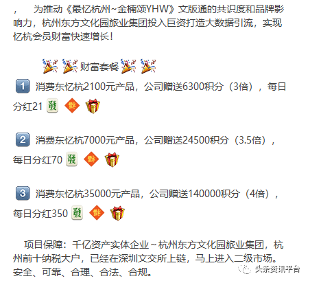 据推广人员介绍,为推动《最忆杭州-金楠颂(YHW)》文版通的共识度和品牌影响力,杭州东方文化园旅业集团投入巨资打造大数据引流,实现忆杭会员财富快速增长,现已推出三项财富套餐:第一,消费东忆杭2100元产品,公司赠送6300积分(3倍),每日分红21;消费东忆杭7000元产品,公司赠送24500积分(3.5倍),每日分红70;消费东忆杭35000元产品,公司赠送140000积分(4倍),每日分红350。