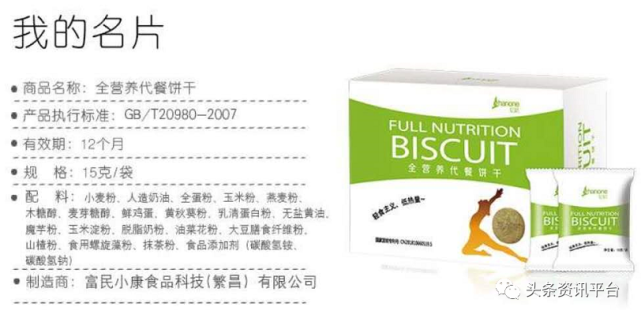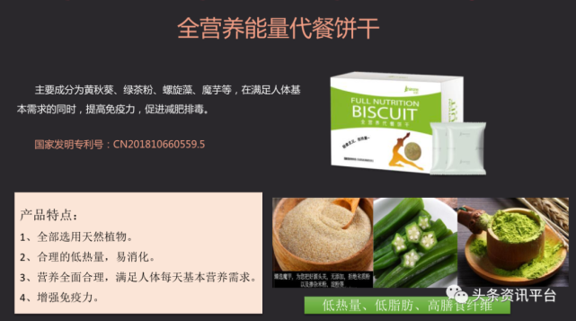 其中,一款名为“全营养能量代餐饼干”的产品还被相关资料宣传为具有提高免疫力等多种功效。