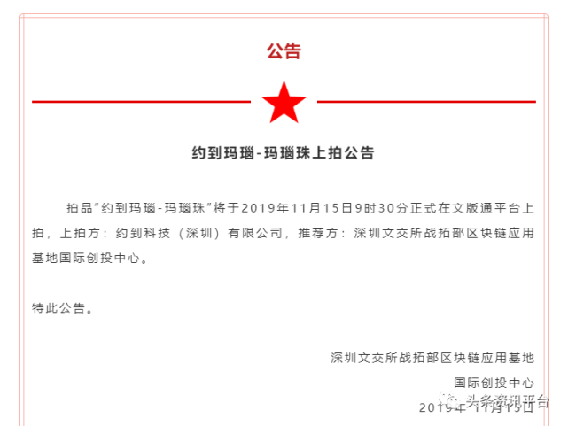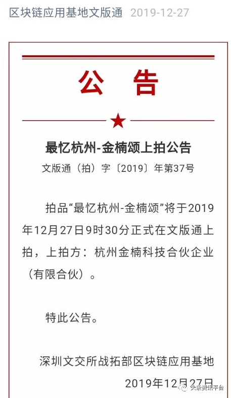 2019年10月21日,深圳文交所战拓部区块链应用基地发布公告称,经深圳文交所战拓部区块链应用基地应用委员会审核,杭州金楠科技合作企业(有限合伙)正式成为深圳文交所战拓部区块链应用基地一级服务商,将通过运用大数据、区块链等新技术,为文化艺术品版权区块链应用基地业务合法、合规做好服务。同年12月27日,拍品《最忆杭州-金楠颂》上拍,按照参与者的说法,通俗来讲,“文版通”或“版通”其实就相当于虚拟币,属于一种文化资产数字资产,具有一定的价值属性;而这个平台就相当于虚拟币交易所,按照文版通官网的解释是:文版通属于深圳文交所的一个文化产权拍卖系统。