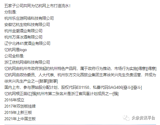 再说回金楠科技,虽然在明面上,经营相关业务的只有金楠科技一家,但在推广人员的口中就变成了五家:杭州乐庄游网络科技有限公司、安徽忆杭生物科技有限公司、杭州金潮酒业有限公司、杭州万泽冰酒有限公司、辽宁北纬41度酒业有限公司,并声称这五家子公司共同为忆杭网上市打造流水,在文版通上挂牌只是一个开始,国内上市才是真正的目标,投资人将有机会参与原始股分配计划,股权代码E01150,私募代码SAG40。