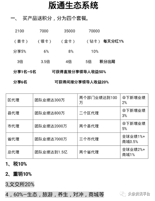 而在资料《版通生态系统》的介绍下,套餐实际上有四个,推广他人加入也有奖金可拿,具体制度如下: