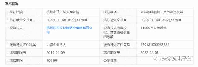 2019年4月,杭州东方文化园旅业集团有限公司被杭州市江干区人民法院冻结股权、其他投资权益合计1.1亿元,冻结期至2022年4月,共1095天。
