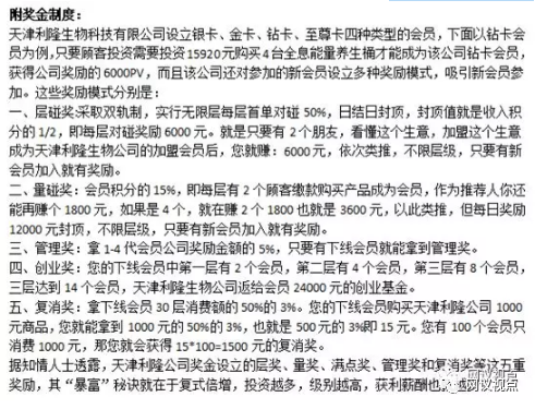 四、满点奖:下线会员满足第一层有2个会员,第二层有4个会员,第三层有8个会员,天津利隆公司就返24000元的创业基金。