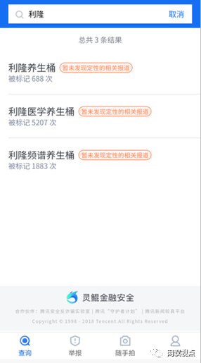 在腾讯灵鲲金融风险平台显示,搜索利隆就有多达3项显示结果,分别是“利隆养生桶”(被标记688次)、“利隆医学养生桶”(被标记5207次)以及“利隆频谱养生桶”(被标记1883次)。主要标签是发展下线拉人头。尽管显示为暂未发现定性的相关报道,但是有网友评论称,利隆利用双轨制从事非法传销活动。