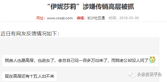 在前两年,有报道指出,伊妮莎莉当时共发展出了两大体系,负责人分别是德众体系创始人赵越和阳光春天体系创始人杨颜宁,该公司在2017年初挂靠永春堂,没多久就独立运作了,每个月有1000多万的业绩。在公司管理层方面,伊妮莎莉董事长为姚仲云,市场总裁赵子谊,市场总监赵越。后来,“长沙社区通”指出,伊妮莎莉公司于2018年4月13日在河南新乡举行所谓的招商会的时候,被当地公安机关会同工商执法部门一举将公司老总和所有在场的传销头目一网打尽,其后多名公司高层在逃。