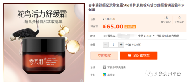 然而在淘宝上,这款相同规格的产品的售价只要65元,发货地也是山东潍坊,店铺名称为“春来雅化妆品工厂店”。一款产品多种标价,不过,其背后的原因似乎并不是那么耐人寻味。