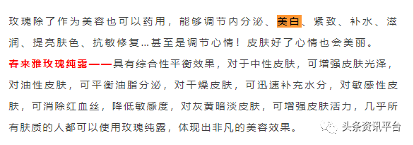 在另外一篇题为《【春来雅玫瑰纯露】把保加利亚的玫瑰花园搬回家》的文章中,公众号“春莱雅”也明确宣传:“春来雅玫瑰纯露:深度补水、抗敏舒缓、控油美白,统统搞定!”