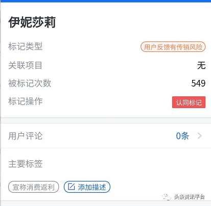 眼下,在腾讯灵鲲金融风险监管平台上,“伊妮莎莉”这个关键词也已被标记了549次,标记类型是“用户反馈有传销风险”,主要标签有“宣称消费返利”的字样。