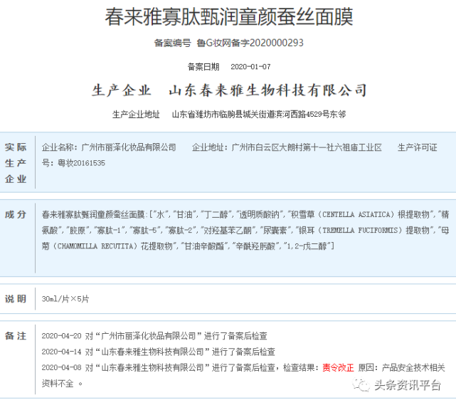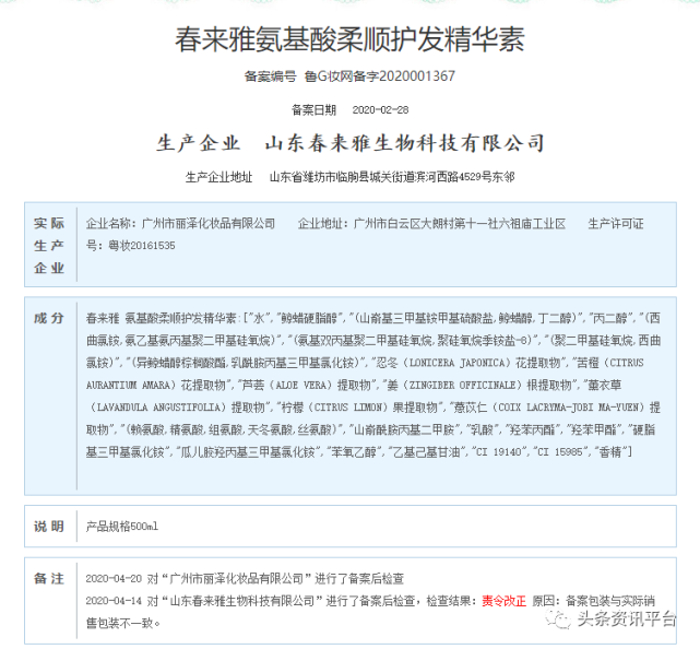 经查国产非特殊用途化妆品备案平台,我们发现“春来雅氨基酸柔顺护发精华素”曾因“备案包装与实际销售包装不一致”被要求责令改正。