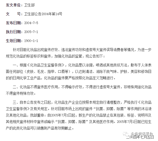 对此,《卫生部关于禁止化妆品进行抗抑菌宣传的公告》明确指出,针对目前市场上出现的宣传“抗菌、抑菌、除菌”等作用的沐浴液及其他化妆品,我部重申:自2005年7月1日起,新生产的化妆品禁止在其包装、标签、说明书及其他相关宣传材料中宣传或暗示“抗菌、抑菌、除菌”及其他医疗作用。