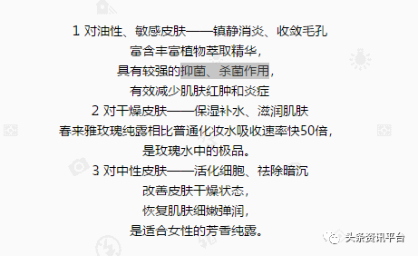 其中,关于“春来雅玫瑰纯露”这款产品,公众号“春莱雅”在题为《春来雅产品课堂【玫瑰纯露】》的文章中指出,“玫瑰除了作为美容也可以药用,能够调节内分泌、美白、紧致、补水、滋润、提亮肤色、抗敏修复…甚至是调节心情!皮肤好了心情也会美丽。春来雅玫瑰纯露——具有综合性平衡效果,对于中性皮肤,可增强皮肤光泽,对油性皮肤,可平衡油脂分泌,对干燥皮肤,可迅速补充水分,对敏感性皮肤,可消除红血丝,降低敏感度,对灰黄暗淡皮肤,可增强皮肤活力,几乎所有肤质的人都可以使用玫瑰纯露,体现出非凡的美容效果。”