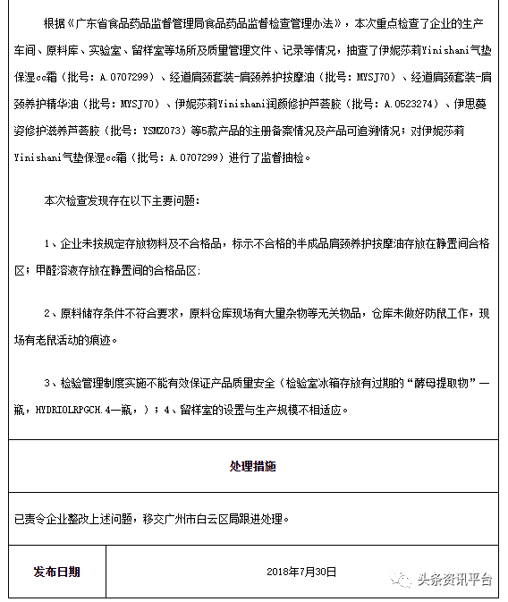根据《广东省食品药品监督管理局食品药品监督检查管理办法》,本次重点检查了企业的生产车间、原料库、实验室、留样室等场所及质量管理文件、记录等情况,抽查了伊妮莎莉Yinishani气垫保湿cc霜(批号:A.0707299)、经道肩颈套装-肩颈养护按摩油(批号:MYSJ70)、经道肩颈套装-肩颈养护精华油(批号:MYSJ70)、伊妮莎莉Yinishani润颜修护芦荟胶(批号:A.0523274)、伊思蔓姿修护滋养芦荟胶(批号:YSMZ073)等5款产品的注册备案情况及产品可追溯情况;对伊妮莎莉Yinishani气垫保湿cc霜(批号:A.0707299)进行了监督抽检。