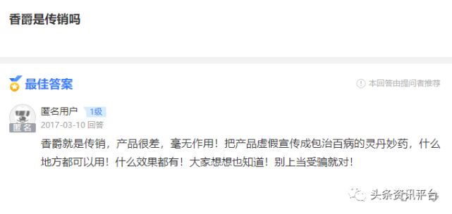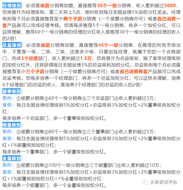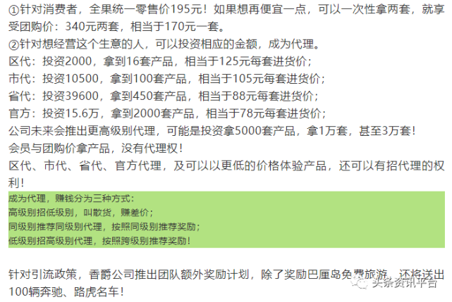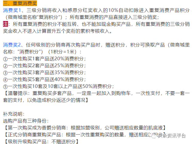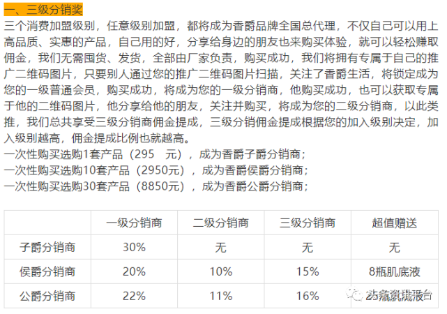 在上篇报道中,我们了解到香爵旗下多款产品都曾遭到责令改正的现状,以及围绕着这些产品传出来的夸大宣传行为,在本篇报道中,我们将把视线聚焦在香爵的奖金制度上,以及该品牌屡遭网友投诉的原因。