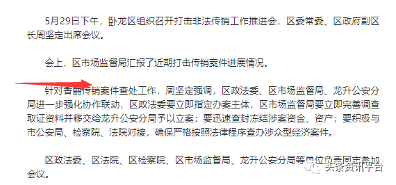 2020年5月29日,一则新闻又将“香爵”送到了舆论的风口浪尖。是时,河南省南阳市卧龙区组织召开打击非法传销工作推进会,区市场监督局汇报了近期打击传销案件进展情况。针对香爵传销案件查处工作,相关领导强调,区政法委、区市场监督局、龙升公安分局进一步强化协作联动,区政法委要立即指定办案主体,区市场监督局要立即完善调查取证资料并移交给龙升公安分局予以立案;要迅速查封冻结涉案资金、资产;要积极与市公安局、检察院、法院对接,确保严格按照法律程序查办涉众型经济案件。