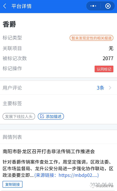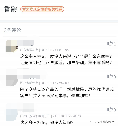 眼下,在腾讯灵鲲金融风险监管平台上,“香爵”这个关键词也已被标记了2077次,虽然标记类型是“暂未发现定性的相关报道”,不过主要标签有“发展下线拉人头”的字样。