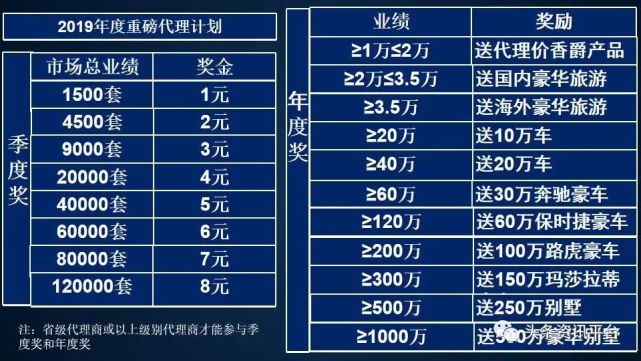 最后一个奖项是年度奖,公司将根据代理商的业绩送豪车、送别墅,年度业绩达到300万元,送150万元的玛莎拉蒂,年度业绩达到1000万元,送价值500万元的豪华别墅。