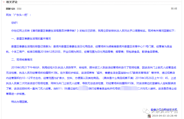 对此,娄底市工商局娄星分局回复称,因该店关门上锁无人经营造成无法检查,拨打经营者手机号码无人接听,该店是否停止经营需进一步核查。