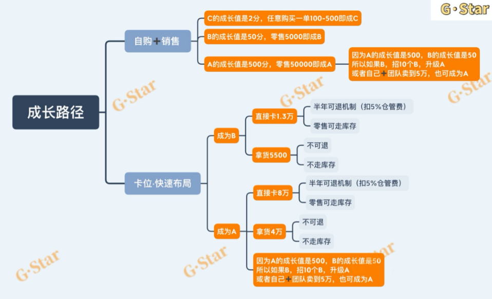 此外,如果高级合伙人招到10个同级别的高级合伙人,也可升级为联合创始人。第二种玩法即提前储值模式;云仓储值1.3万直接成为高级合伙人,享受6.5折。下面的人全部出你云仓的储值,无需打包、无需发货。而且享受直推升级,目前你只需要直推7人即可抵达联合创始人。云仓储值8万,就可以直接升级为联合创始人,旗下所有的人,不管是自购会员还是高级合伙人,全部出你的云仓;第三种玩法为囤货模式。5500元直接把货拿回家,成为高级合伙人;40000元直接把货拿回家,成为联合创始人。