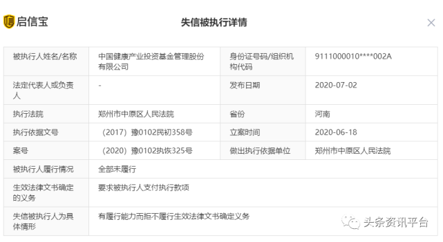 而中国健康产业投资基金管理股份有限公司在近年来竟也已数次沦为被执行人,据企查查显示,该公司的未履行比例高达百分之九十以上。
